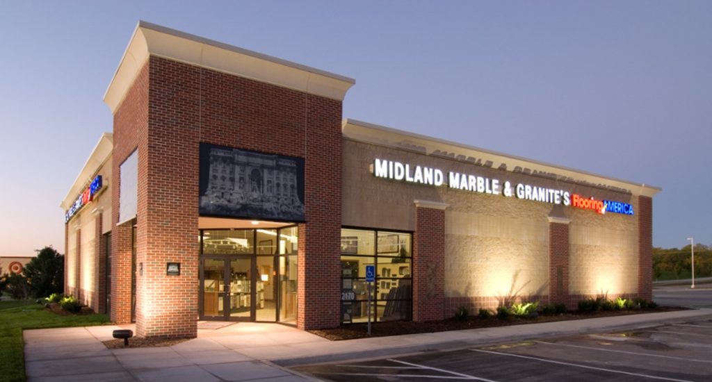 Midland Marble & Granite’s Flooring America Overland Park store is a showcase for all of their high – quality products which includes floor and wall tile, wood and carpet flooring, granite countertops, and a range of kitchen and restroom appliances. Clay-Pro Construction worked with the owner to install a wide variety of materials in a number of different applications, each requiring flawless installation quality. The entrance features elaborate images of an American flag and an historic building etched in granite tiles.
